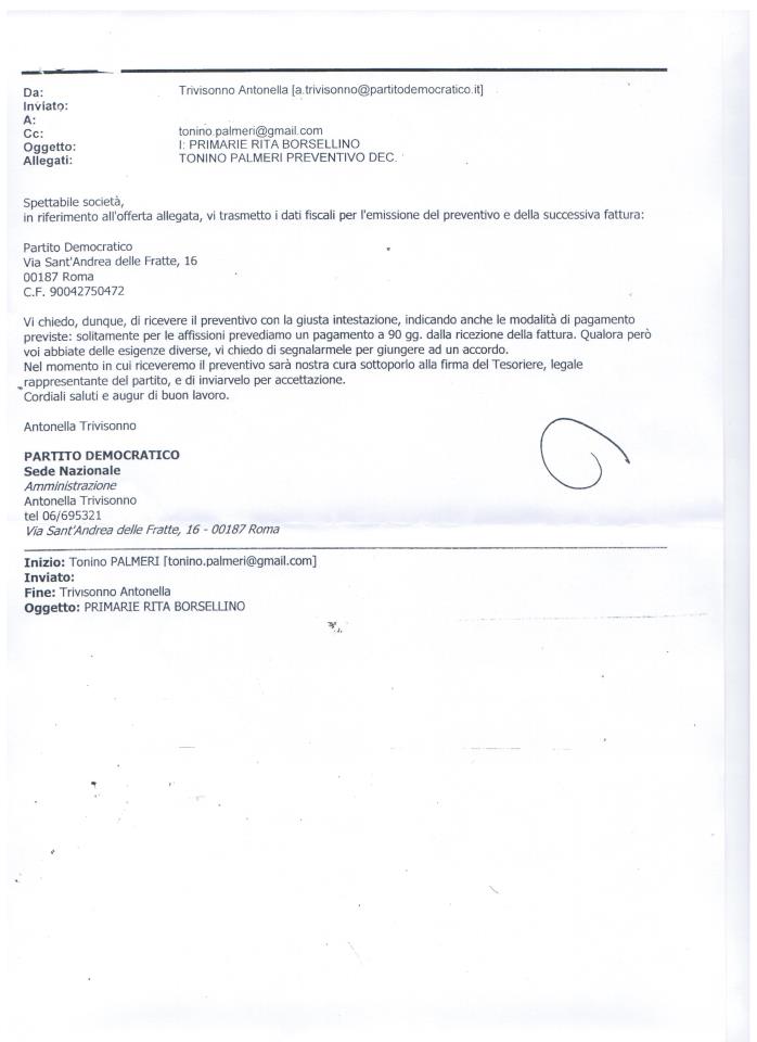 Ecco la mail inviata dall'amministrazione nazionale del PD, in riferimento alla campagna elettorale di Rita Borsellino, in cui vengono forniti i dati per l'emissione di un preventivo e per il successivo pagamento. L'ho mostrata in conferenza stampa ed è la prova che quanto ho affermato è la verità: il mio partito paga i manifesti della Borsellino. Questo ed altri elementi mi hanno dato la certezza di quanto affermo, spingendomi a denunciare un fatto che - ripeto - definisco “scandaloso”. Non temo querele. Ma mi attendevo delle risposte, che però non sono arrivate. Come mai?