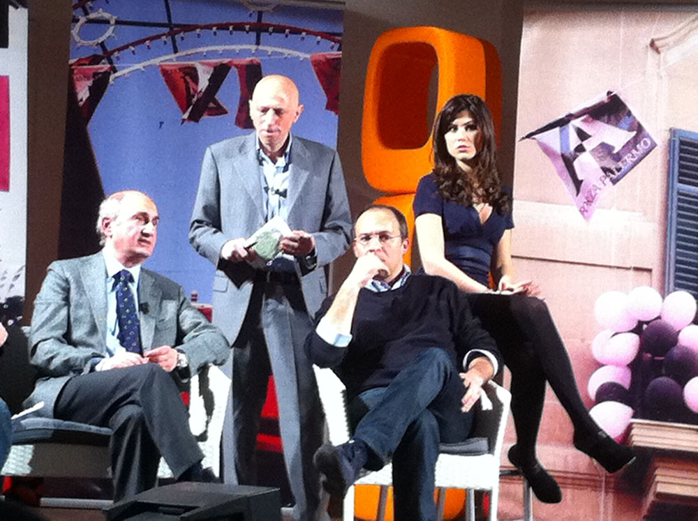 Ancora calcio, in questa mia domenica piena di emozioni. Stamattina in campo con Matteo Renzi e un po' di amici, questa sera ospite del talk di Tgs Studio Stadio, per commentare in diretta la partita. Palermo-Lazio: una vittoria clamorosa. In studio, sullo sfondo, immagini di angoli di città: lo stesso spunto che avevo scelto ieri, per la scenografia dell'evento al Teatro Golden. Il palco che diventava piazza, strada, luogo di scambio e di lavoro comune. Continuano i rimandi, le corrispondenze. Il Palermo stasera ha portato a casa cinque goal (cinque come gli obiettivi raggiunti dal Pac-Davide nel nuovo spot-game!). Questo significa che un buon gioco di squadra premia sempre, mettendo a frutto le energie investite. Da soli non si arriva lontano: è sommando la forza, il talento, la convinzione di ognuno che si raggiunge la meta, centimetro dopo centimetro. Riconoscere e coltivare l'idea di comunità: la prima cosa che ci rende "cittadini".