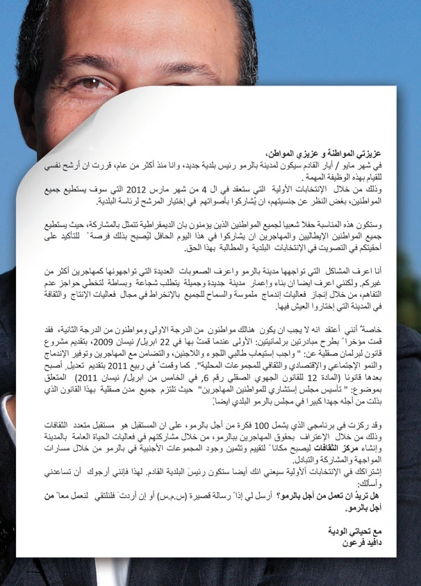 Sono convinto, fortemente, che Palermo deve ritornare a essere la culla delle civiltà, il luogo in cui si mescolano culture e religioni, una città multietnica, una finestra aperta sul Mediterraneo. Per far questo è necessario ascoltare le tante comunità presenti in città, rispondere alle loro domande e chiedergli un impegno concreto per far rinascere Palermo. Perché nessuno deve e può sentirsi escluso.