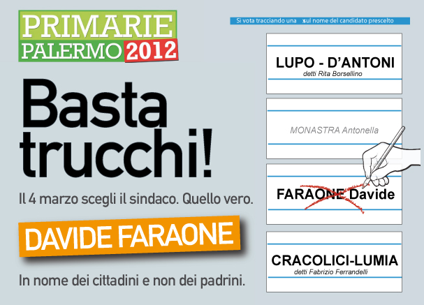 I palermitani sono stanchi di trucchi e, dopo l'allarme del commissario Latella sulle condizioni finanziarie del comune, chiedono alla politica di non far fallire Palermo. I cittadini hanno già assistito a dieci anni di amministrazione Cammarata, controfigura di notabili romani e locali; non penso vogliano ripetere questa triste esperienza. Domenica alle primarie si vota il vero sindaco e la scelta non è tra me, la Borsellino e Ferrandelli. Ma tra me, Lupo-D'Antoni e Cracolici-Lumia. I cittadini non sono scemi, capiranno chi si batterà per loro e per far rinascere Palermo e chi invece si batte solo per garantire i suoi padrini politici.