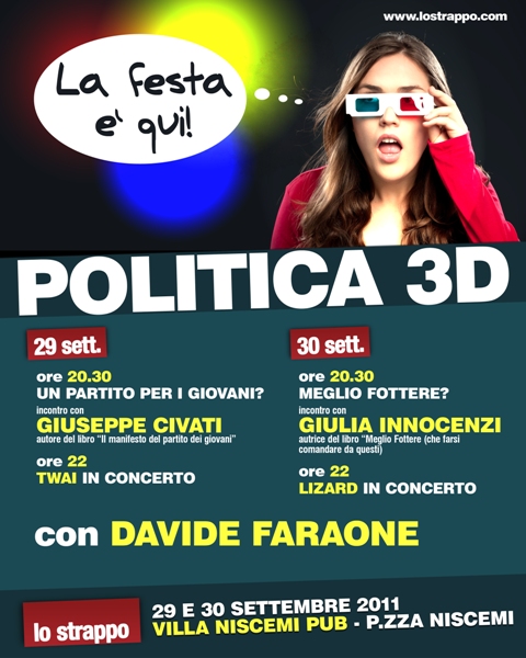 Dopo la presentazione a Palermo, a maggio scorso, del libro del sindaco di Firenze, Matteo Renzi, lo Strappo torna a parlare di giovani e di politica con una due giorni di dibattiti e musica. Giovedì 29 e venerdì 30 settembre 2011, il movimento che condivide e sostiene la candidatura di Davide Faraone a sindaco di Palermo ha organizzato una festa a Villa Niscemi Pub (piazza Niscemi, Palermo) con Davide Faraone, candidato a sindaco di Palermo, Giuseppe Civati, consigliere regionale in Lombardia del Pd, autore del libro “Il manifesto del partito dei giovani” e Giulia Innocenzi, la conduttrice di Generazione Zero, lo spazio di Annozero dedicato ai giovani, che presenterà il suo libro “Meglio Fottere (che farsi comandare da questi)”. Gli incontri sono fissati alle 20.30, poi alle 22 spazio alla musica con i Twai e i Lizard.