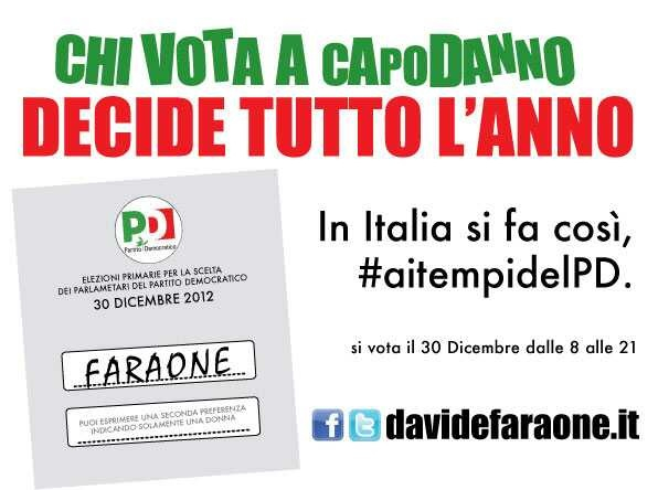 Vi prometto che il 30 dicembre sarà l'ultima volta che vi chiederemo, per il 2012, di andare a votare. Non perché smettiamo con l'attività politica, ma semplicemente perché l'anno é finito e non c'è il tempo di un'altra elezione. Liste bloccate e garanzie, non sono le nostre parole d'ordine. Ma con primarie e partecipazione democratica, noi siamo in campo, con le nostre idee, con le nostre facce. Eh già. Dav